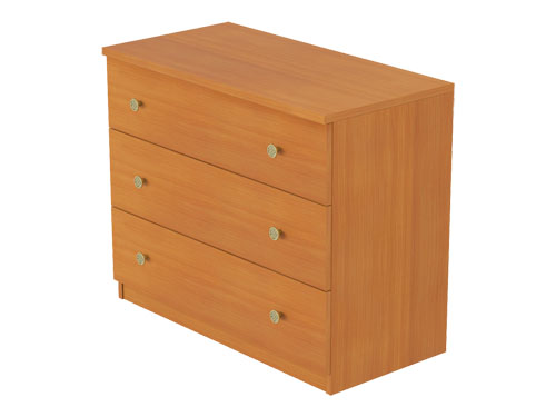 Вместительный комод с тремя выдвижными ящиками. Топ тумбы выполнен из ЛДСП толщиной 22 мм, торцы облицованы ПВХ кромкой 2 мм. Каркас тумбы выполнен из ЛДСП толщиной 18 мм. ЛДСП меламиновое, класс эмиссии Е1, рекомендовано для использования в медицинских и детских учреждениях.