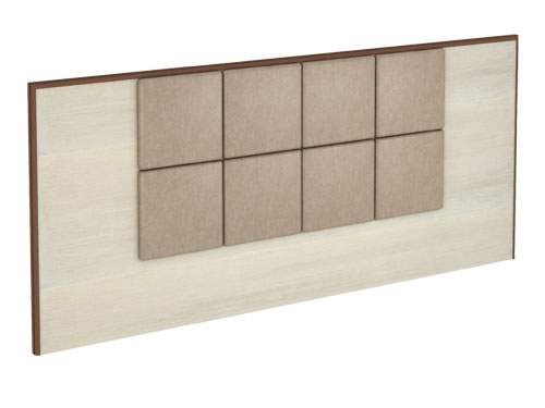 Панель изголовья для двуспальной кровати украшена 8-ю квадратными сегментами, обитыми однотонной декоративной тканью.  Панель выполнена из ЛДСП толщиной 16 мм. На лицевой части панели, по периметру, располагаются накладки из массива бука, тонированные в цвет "Дуб Шамони Темный".  Размер панели 2750х48х1000 мм. Возможная комбинация: кровать двуспальная + 2 тумбы прикроватных.