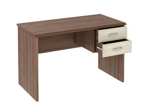 Каркас стола выполнен из ЛДСП толщиной 25 мм, облицован кромкой ПВХ 2 мм; задняя стенка стола, тумба подвесная и стенки ящиков -  ЛДСП 16 мм, кромка ПВХ толщиной 0,4 мм. Донья ящиков выполнены из ХДФ  толщиной 3,4 мм. На передней кромке столешницы располагается накладка из массива Бука, тонированная в цвет столешницы. Лицевая фурнитура - матовый хром. Направляющие для ящиков- фирма "Hettich". Стол письменный для обустройства интерьера гостиничного номера, студенческого общежития.