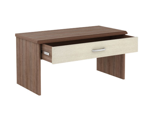 Корпус тумбы под телевизор выполнены из ЛДСП толщиной 25 мм, облицовка кромки ПВХ толщиной 2 мм. Задняя стенка и стенки ящика выполнены из ЛДСП 16 мм, кромка ПВХ толщиной 0,4 мм. Донья ящика выполнены из ХДФ толщиной 3,4 мм. На передней части топа тумбы располагается накладка из массива Бука, тонированная в цвет топа. Лицевая фурнитура - матовый хром. Направляющие для ящиков- фирма "Hettich".