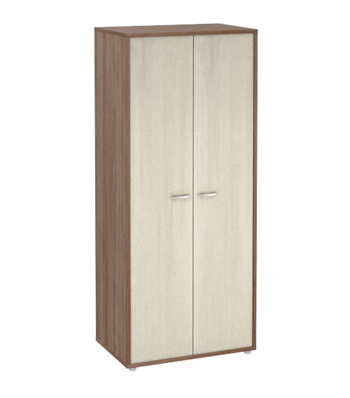 Внешний корпус шкафа для одежды двух- дверного выполнен из ЛДСП толщиной 25 мм. Внутренние стенки, двери шкафа выполнены из ЛДСП 16 мм.  Задняя стенка - ХДФ толщиной 3,4 мм. На передней кромке топа шкафа расположены накладки из массива Бука, тонированные в цвет топа шкафа. Лицевая фурнитура - матовый хром.